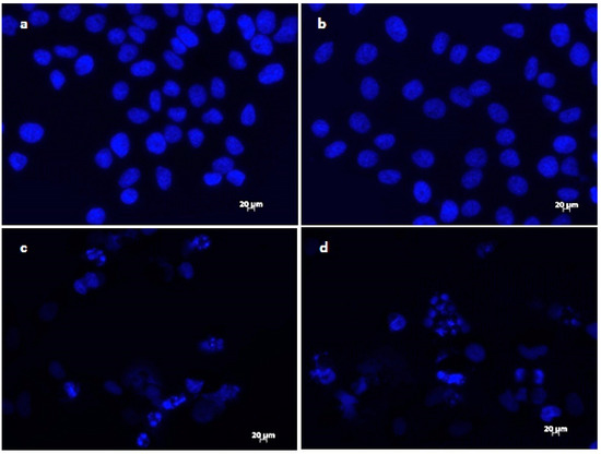 The results of DAPI staining analysis confirmed that treatment with onion extracts at IC50 concentration induced apoptosis in HeLa cells. As illustrated in Figure 3a,b, untreated cells are round with normal morphology. Cells treated with onion extracts (Figure 3c–e) showed changed morphology, cell shrinkage, chromatin condensation, fragmentation of DNA, and formation of apoptotic bodies [70]. These changes are an indicator of cell death and, therefore, the evidence of possible mechanism of cytotoxic activity of both extracts.
