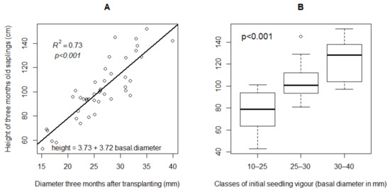 Growth of V. doniana saplings in height three months after transplanting. (A) Regression plot between plant diameter and height. (B) Boxplot of mean height per initial seedling vigor class. R2: Adjusted determination coefficient of the regression model; p < 0.001: correlation between height of sapling and basal diameter of sapling highly significant.
