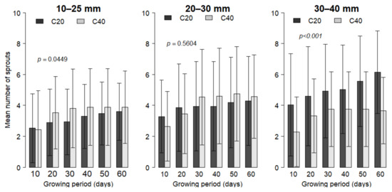 Within 60 days, the length of new shoots varied from 0.40 cm to 104.80 cm, when considering all the applied management treatments (Figure 4). On average, sprouts length on the 60th day was 217.47 ± 12.40 mm and 262.36 ± 15.02 mm on the shorter and the longer coppices, respectively. On the small, medium, and vigorous seedlings, the mean length of sprout on the 60th day was 262.82 ± 16.52 mm, 202.11 ± 14.32 mm, and 255.76 ± 19.73 mm, respectively. The analysis of variance indicated that coppicing height and the initial seedling vigor had significant effects on sprout length (p < 0.05). There was also a significant interaction effect of coppicing height and initial seedling vigor on sprout length (p < 0.001). On longer coppices, the sprouts grew faster from vigorous seedlings at transplanting (IBSD > 30 mm); while on shorter coppices, sprouts grew faster from thinner seedlings (IBSD ≤ 25 mm).