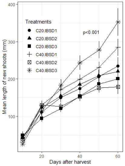 Length of new shoots per treatment, over 60 days after pruning. Coppicing regimes: C20 = coppicing at 20 cm above ground; C40 = coppicing at 40 cm above ground. Initial vigor classes: ISBD1 = 10–25 mm; ISBD2 = 20–30 mm, ISBD3 = 30–40 mm. p < 0.001: highly significant difference in length of new shoots among treatments.