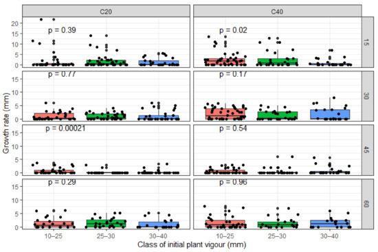 Mean stem growth rate in diameter per coppicing regime and per initial plant vigor over 60 days after pruning. Coppicing regimes: C20 = coppicing at 20 cm above ground; C40 = coppicing at 40 cm above ground. Initial vigor classes: ISBD1 = 10–25 mm; ISBD2 = 20–30 mm, ISBD3 = 30–40 mm. p-values indicated significance level of difference in growth rate among treatments. p > 0.05: No difference; p < 0.05: significant difference; p < 0.001: highly significant difference.