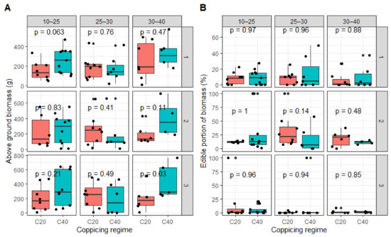 (A) Above ground biomass, and (B) edible portion of biomass per coppicing regime and per initial plant vigor, over three harvests. Coppicing regimes: C20 = coppicing at 20 cm above ground; C40 = coppicing at 40 cm above ground. Initial vigor classes: ISBD1 = 10–25 mm; ISBD2 = 20–30 mm, ISBD3 = 30–40 mm. p-values indicated significance level of difference in above ground biomass production among treatments. p > 0.05: No difference; p < 0.05: significant difference.