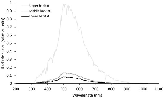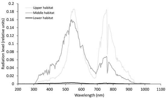 Relative solar radiation levels at noon-time for the different wavelengths for the three habitats in June. Average photosynthetically active radiation in the upper habitat, 158 µmol m−2s−1; middle habitat, 125 µmol m−2s−1; lower habitat, 2 µmol m−2s−1.