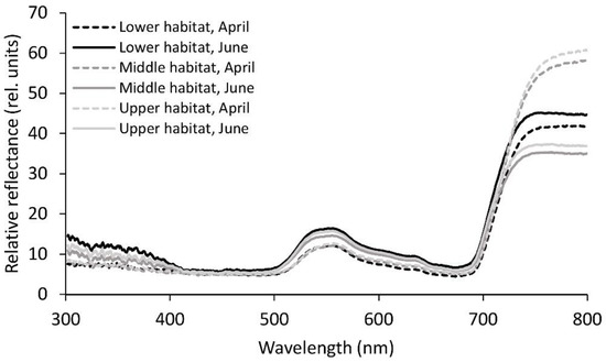 Mean relative reflectance spectra from 300 to 800 nm for the Phyllitis scolopendrium fronds from the three different habitats, sampled in April and June. The data were smoothed using moving averages with a period of five consecutive measurements (n = 10).