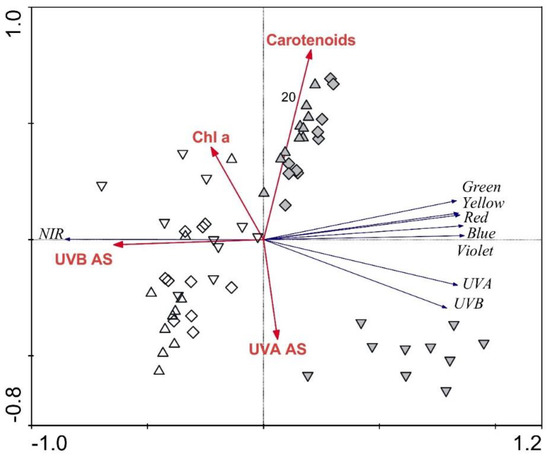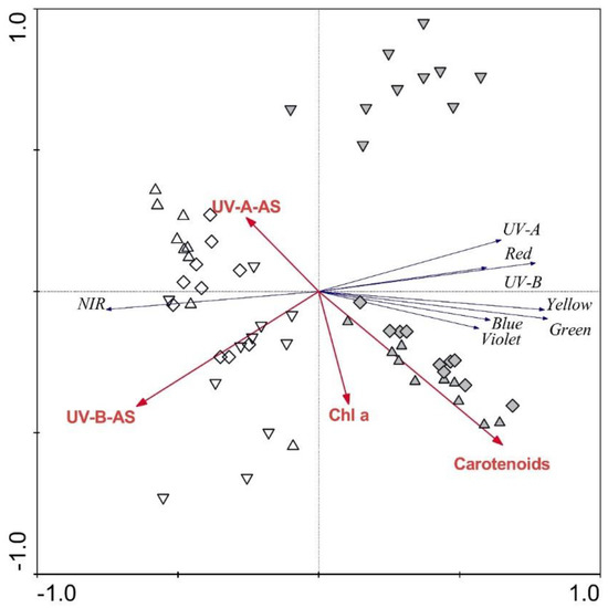 The RDA plot showing the strength of the associations between frond morphological parameters and frond reflectance spectra revealed the relatively low importance of frond morphology in explaining the reflectance spectra. Only frond thickness was significant (p ≤ 0.05), explaining 9% of the reflectance spectra variability. The RDA plot showing the strength of the associations between frond biochemical parameters and the regions of the reflectance spectra (Figure 5) revealed the high importance of frond biochemistry in explaining frond reflectance. When examining simple effects, carotenoids alone explained 23%, and UV-B-absorbing substances alone explained 22% of the spectra variability. When tested altogether, carotenoids and UV-B-absorbing substances explained 23% (p = 0.01) and 13% (p = 0.01), respectively, chlorophyll a explained 12% (p = 0.02), and UV-A-absorbing substances explained additional 6%. April samples are positioned in the left part of the plot, while June samples are mainly located in the right part of the plot.