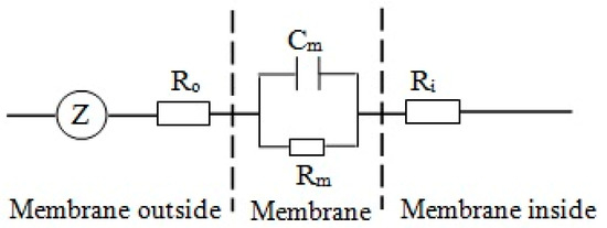 Almost all life activities in plants are closely related to electrical processes [1]. The cell membrane of a mesophyll cell has strictly selective permeability to various ions, ion groups and electric dipoles, and the electrolyte solutions on the two sides of the cell membrane form a specific conductive state. The inside and outside of the cell membrane can be simulated as a capacitor, where the electrolyte solution on both sides of the membrane is equivalent to the two plates of the capacitor, and the cell membrane is equivalent to the intermediate medium of the capacitor. Moreover, organelles, such as vacuoles and cytoplasm in cells, are equivalent to resistors. Thus, a mesophyll cell can be modeled as a concentric sphere capacitor with both inductor and resistor functions [8,9,21]. The simplified equivalent circuit of a mesophyll cell is illustrated in Figure 1.
