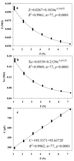 The Nernst equation is an equation used to quantitatively describe the electrical potential formed by ions between systems A and B, and can also theoretically be used to quantitatively describe the diffusion gradient of electrolytes inside and outside the cell membrane [21,22]. Using the Nernst equation, the Z (or Xc) = y of the theoretical intrinsic relationships between the clamping force and leaf Z and Xc was revealed in this paper for the first time. The Gibbs free energy means that the reduced internal energy of the system can be converted into the work done by the system, and the Gibbs free energy of the leaf cell capacitor is theoretically equal to the work by clamping force. According to Gibbs free energy, the of the theoretical intrinsic relationships between the clamping force and leaf C was also revealed for the first time. The results demonstrated that the fitting equations of Z–F, Xc–F and C–F had good correlations, which highlighted the existence of the above-mentioned intrinsic mechanism.