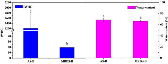IWHC and water content of B. papyrifera in the two habitats. Values indicate the mean ± SD, n = 12. Lower case letters indicate significant differences at a 5% level (p < 0.05). AS-B: B. papyrifera grown in agricultural soil, MRDS-B: B. papyrifera grown in moderately rocky desertified soil.