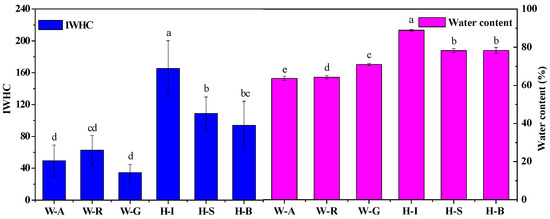 Intracellular water-holding capacity (IWHC) and water content of the six plants. Values indicate the mean ± SD, n = 12. Lower case letters indicate significant differences at a 5% level (p < 0.05). W-A: Woody plant-Amygdalus persica, W-R: Woody plant-Rhus chinensis, W-G: Woody plant- Ginkgo biloba, H-I: Herbaceous plants-Ipomoea batatas, H-S: Herbaceous plants-Senecio scandens, H-B: Herbaceous plants-Boehmeria penduliflora.