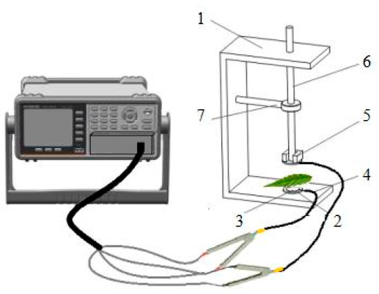 The leaf C and Z values were measured using a LCR tester (model 6300, Gwinstek, Taiwan, China), with a frequency and voltage of 3.0 kHz and 1.5 V, respectively, as used by Zhang et al. [16], with modifications. The center of the leaf was clipped between two copper electrodes in a homemade parallel-plate capacitor with a diameter of 7 mm (Figure 5). The leaf Z and C values were measured continuously at different clamping forces (1.139, 2.149, 3.178, 4.212, 5.245, 6.262 and 7.311 N), while adding iron blocks, and 11–13 data points were recorded at each clamping force. The 1 N of clipping force corresponded to the 0.26 bar of pressure on the plant leaves. The mesophyll cells are connected with plasmodesmata, thus, forming low-resistance routes for passing the electrical current. Most plant mesophyll cells can be divided into long cylindrical palisade tissue cells and irregularly spherical sponge tissue cells. In order to simplify the scientific problem, every mesophyll cell can be regarded as a concentric sphere capacitor. Thus, many aligned mesophyll cells (or symplast) comprise the leaf capacitor. To ensure that the voltage of each capacitor was consistent, the parallel connection mode of LCR was used. The leaf Xc was calculated according to Equation (29):