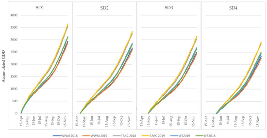 Rate of growing degree day accumulation over the growing season (April to November) at each location and year from each sowing date (SD1–4).