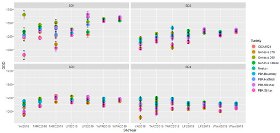 Growing degree days influenced the overall growth and phenological development. Emergence was delayed with later sowing, (e.g., SD3 and SD4) due to decreased soil temperature in late autumn (Table 1), requiring a longer time to satisfy the minimum GDD for emergence. Time to flowering was accelerated with later sowing and the accompanying slower accumulation of GDD. Delays in flowering have been shown to be negatively associated with grain yield in heat stressed experiments [17]. Generally, in early flowering genotypes the stored soil moisture is used during the reproductive phase as opposed to during the vegetative phase as is the case with late maturing genotypes. In the drought stressed YAI experiment, in 2018, the early maturing genotypes such as PBA Striker flowered at 1100 GDD, while at the nearby irrigated LFS experiment it flowered after accumulating over 1250 GDD (Figure 2). In addition to the 87 mm of in-season rainfall, the YAI experiment received 77 mm pre-sowing and 64 mm in-crop irrigation, compared to the LFS experiment which received 220 mm pre-sowing and 24 mm in-crop irrigation; the long-term average for growing season rainfall (April–October) for the region is 225 mm. At YAI, the pre-sowing irrigation was enough to enable emergence, but was insufficient to maintain crop growth throughout the season hence the need for supplementary in-crop irrigation.