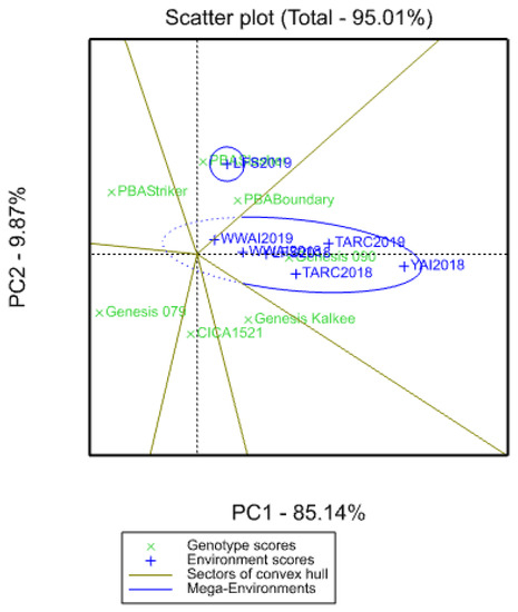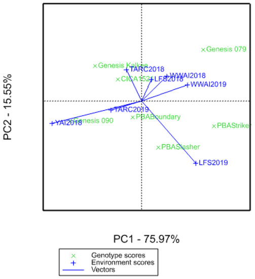 In the AMMI model, environments LFS2018, WWAI2018, and WWAI2019 which are geographically closer, clustered together meaning they influence genotypes in a similar way (Figure 2.). However, they did not cluster with YAI2018 and LFS2019, which are also in southern NSW. In the drought stressed YAI2018, phenological development was quicker, a phenomenon commonly observed in chickpea [28,29]. Additionally, the early genotype PBA Striker matured significantly earlier at the YAI experiment than at the adjacent LFS experiment. Also, environment LFS2019 was an outlier when the experiments were clustered into mega-environments using the GGE model, while the other six fell into the same mega-environment. This is most likely a result of moderate levels of ascochyta blight observed early in the season but later contained by fungicides. The TARC environments had different watering regimes in the two years and distinctly stood out in the AMMI analysis but were in the same mega-environment.