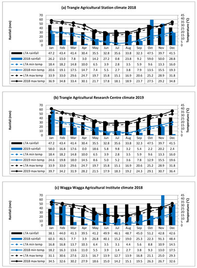 (a–f) Rainfall, minimum (min.) and maximum (max.) temperatures recorded in 2018 and 2019, together with the long-term averages (LTA) at TARC, WWAI, LFS, and YAI.