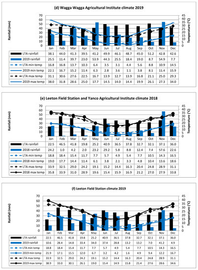 Experiments were conducted at Trangie in central western NSW and Wagga Wagga, Leeton and Yanco in southern NSW in 2018 and 2019 (Yanco 2018 only). Table 3 provides details of the experimental sites, seasonal rainfall, supplementary irrigation and overall management practices. Monthly rainfall, minimum and maximum temperatures for 2018 and 2019, together with long term site averages, obtained from the Australian Bureau of Meteorology (BOM) website (http://www.bom.gov.au), are shown in Figure 5a–f. In 2018, the experiments were conducted at all four locations: Trangie Agricultural Research Centre (TARC), Wagga Wagga Agricultural Institute (WWAI), Leeton Field Station (LFS) and Yanco Agricultural Institute (YAI). The YAI, which is nearby (6 km) to LFS was treated as a drought stressed experiment. The sowing times were similar at all sites, with fortnightly sowing from mid-April to end of May. These sowing times were selected to cover all likely sowing dates within, and slightly earlier than, the commercially recommended sowing window.