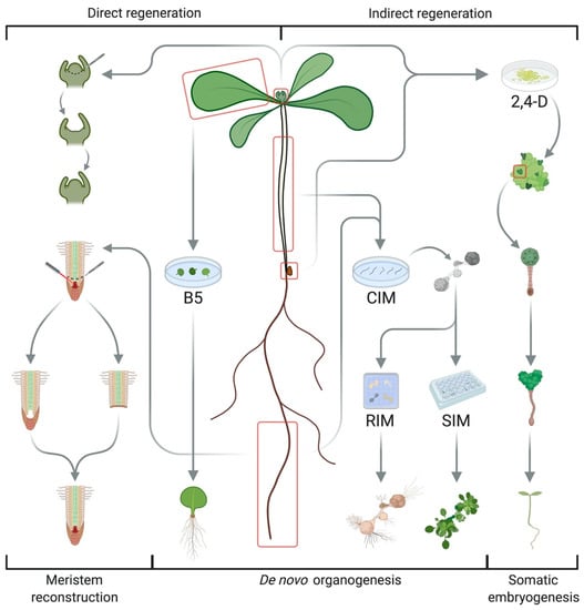 While simple organisms such as liverworts and mosses are able to reconstruct their full body without additional hormonal signals after injury [9], regeneration in seed plants involves a complex interplay of multiple inductive cues to repair cuts or recreate organs [10]. Cereals and woody species often show recalcitrance to tissue cultivation and micropropagation due to restricted availability or accessibility of pluripotent stem cells [7]. Three key systems have been used to study and exploit plant regeneration in Arabidopsis thaliana (Figure 1) [1,2]. The first is based on an extensive capacity for wound repair and organ reconstruction that allows for root tip regeneration after laser ablation of the quiescent center (QC) or excision of the root apical meristem (RAM), the repair of stem tissues after incision and reconnection of the vasculature of stock and scion during grafting, all relying on populations of competent cells in the adult plant body and polar auxin transport [2,10]. Besides tissue repair, the two most common types of regeneration in higher plants are somatic embryogenesis and de novo organogenesis, which can both occur in a direct or indirect way depending on the requirement for an intermediate callus stage (Figure 1) [1,11]. Somatic embryogenesis reinitiates embryonic developmental sequences in (de)differentiated cells to generate bipolar structures with a clear distinction between root and shoot meristems [1,2,8,12]. This can be induced by abiotic stresses such as salt, heavy metals, heat, and drought [13,14], but it is usually achieved by treatment with the synthetic auxin 2,4-dichlorophenoxyacetic acid (2,4-D) via the formation of embryogenic callus [8,12]. The subsequent transfer of explants to hormone-free medium initiates somatic embryogenesis, creating cellular structures reminiscent of globular, heart-shaped, and torpedo-shaped embryogenic stages through the coordinated action of transcription factors (TFs) such as LEAFY COTYLEDON (LEC) 1 and 2, AGAMOUS-LIKE 15 (AGL15), FUSCA 3 (FUS3), BABYBOOM (BBM), and EMBRYOMAKER (EMK) [5,8,12]. De novo organogenesis, on the other hand, refers to the formation of new meristems from pluripotent stem cells to reconstruct organs [2]. Typical examples include adventitious rooting from detached leaves, petioles, or hypocotyls (also termed rhizogenesis) and shoot regeneration from in vitro cultured root or hypocotyl segments (sometimes referred to as caulogenesis) [10]. The outcome of both processes is governed by the plant hormones auxin and cytokinin as a high auxin ratio favors root growth, while high cytokinin content promotes shoot fate [4]. De novo root regeneration has been exploited for vegetative propagation through cuttings and can be achieved by cultivation on auxin-rich callus-inducing medium (CIM), followed by transfer to root induction medium (RIM) with less or no auxin [2,10]. More recent systems dispense with external hormone supply, resulting in direct root regeneration governed by wounding, endogenous hormone levels, and a transcriptional cascade involving WUSCHEL-RELATED HOMEOBOX (WOX) 11 and 12, WOX5&7, and LATERAL ORGAN BOUNDARIES DOMAIN (LBD) 16 and 29 [15,16,17]. Similarly, the two-step protocol for de novo shoot organogenesis, in which explants are preincubated on auxin-rich CIM before transfer to shoot induction medium (SIM) with high cytokinin levels, constitutes a vital step in many transformation protocols [4,10,18]. Aside from hormone signaling, shoot regeneration involves wound responses for callus formation from founder cells and acquisition of organogenic competence, followed by transdifferentiation of root-like protuberances into shoot primordia, patterning of the shoot apical meristem (SAM), and subsequent organ outgrowth [4,7,19,20,21,22]. Cellular and molecular events underlying these stages are discussed in the next section.
