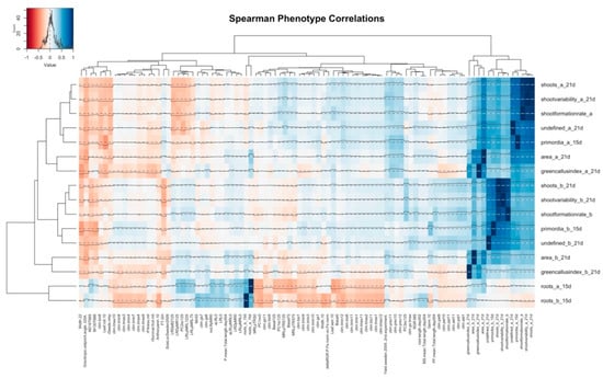 Spearman’s rho for pairwise comparisons between 16 regeneration traits in 170 Arabidopsis accessions [80] and 78 public phenotypes from AraPheno scored in at least 50 of these accessions and was significantly associated to at least one regeneration trait (FDR < 0.3) [153]. Dendrograms are based on Euclidean distances, and the legend in the upper left corner shows the color gradient and histogram of correlation coefficients. The value of the latter is also reflected by grey trace lines in the main plot. Significance is based on FDR-adjusted p-values from Spearman’s test (. = p ≤ 0.1, * = p ≤ 0.05, ** = p ≤ 0.01, *** = p ≤ 0.001). Accurate descriptions of all phenotypes can be found at https://arapheno.1001genomes.org/phenotypes.