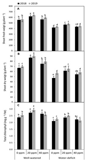 Effect of foliar application of melatonin (MT) at 0, 20 and 40 ppm on shoot fresh weight (A), shoot dry weight (B), and total chlorophyll (C) of tomato plants grown under well-watered and water deficit conditions in the seasons of 2018 and 2019. Means of three replicates were presented ±SD. Different letters are significant differences, according to Duncan’s multiple range tests (p < 0.05).