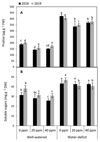 Plants resist the dehydration of their leaf tissues by the accumulation of several organic substances and osmolytes. These molecules play a vital role in the osmotic adjustment and uptake of water under drought conditions [62]. Among these substances, the accumulation of proline and soluble sugars in the leaves was investigated in this study; our results indicated that water deficit caused an increase in proline and soluble sugars compared to the well-watered plants in both seasons. These results were in agreement with several previous reports [11,18].