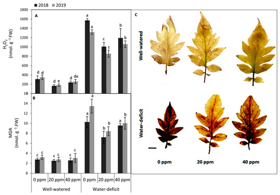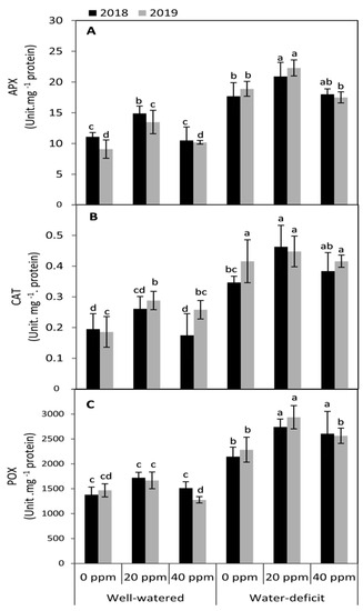 Effect of foliar application of melatonin (MT) at 0, 20 and 40 ppm on the activities of antioxidant enzymes; ascorbate peroxidase (POX; A), catalase (CAT; B) and peroxidase (POX, C) of tomato plants grown under well-watered and water deficit conditions in the seasons of 2018 and 2019. Means of three replicates were presented ±SD. Different letters are significant differences, according to Duncan’s multiple range tests (p < 0.05).