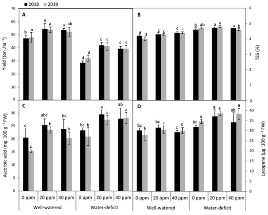 Effect of foliar application of d melatonin (MT) at 0, 20 and 40 ppm on (A) fruit yield, (B) total soluble solids (TSS), (C) ascorbic acid and (D) lycopene of tomato plants grown under well-watered and water deficit conditions in the seasons of 2018 and 2019. Means of three replicates were presented ±SD. Different letters are significant differences, according to Duncan’s multiple range tests (p < 0.05).