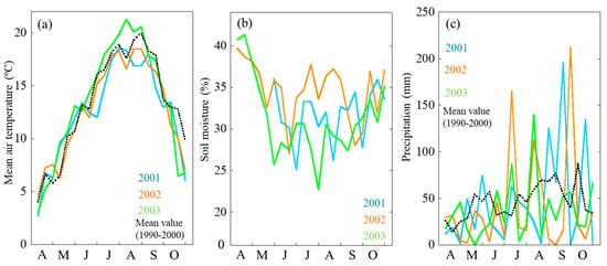 Seasonal and annual changes in mean daily air temperature (a), soil moisture (b) and precipitation (c). Different colors indicate the different year and mean value: light blue, 2001; orange, 2002; light green, 2003; dashed line, mean value from 1990 to 2000.
