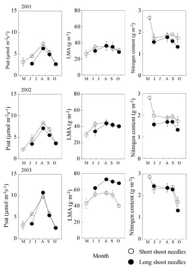 Seasonal and annual changes of Psat, LMA, and nitrogen content from 2001 to 2003. Open cycles are short shoots, and closed cycles are long shoots.