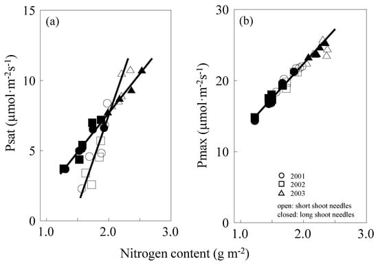 Our study found that there were large seasonal and yearly variations in the photosynthetic capacity of the two shoot types (Figure 2). The pattern of seasonal changes in LMA and N was found to be similar in needles of both shoot types. As a result, a clear positive correlation was determined between N and Psat or Pmax (Figure 3). Photosynthetic capacity is determined both by climatic conditions and by status of leaf morphology, CO2 diffusion, N allocation to photosynthetic organs, kinetics of Rubisco, and others. [1,2,8,40,43,44]. In loblolly pine (Pinus taeda) canopy, year-to-year variation in its microenvironment led to large variations in Psat, which was shown as a stomatal limitation [34]. In a mixed deciduous forest, Bassow and Bazzaz [35] found that Psat differs significantly not only between species but also among individuals within a species.