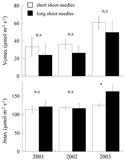 The maximum rates of RuBP carboxylation (Vcmax) and the maximum rate of electron transport driving the RuBP regeneration (Jmax) of short- and long-shoot needles in August for 3 years. Open bars indicate short-shoot needles, while closed bars indicate long-shoot needles. n.s. means not significant. * indicates the statistical difference between short- and long-shoot needles. Vertical line on each bar indicates standard error (SE).