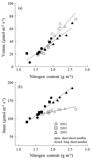 (a) Relationship between the maximum rates of RuBP carboxylation (Vcmax) and leaf nitrogen content and (b) the maximum rate of electron transport driving the RuBP regeneration (Jmax) and leaf nitrogen content of both short- and long-shoot needles. ○, 2001; □, 2002; △, 2003. Open cycles are short-shoot needles, while closed cycles are long-shoot needles.
