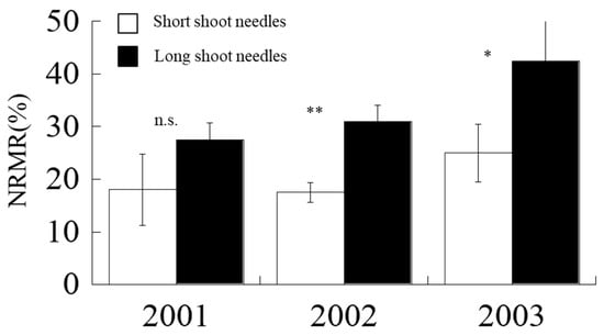 Nitrogen remobilization rates (NRMR) of short and long shoots from 2001 to 2003. Vertical line on each bar indicates standard error (SE). n.s. means not significant. * and ** imply significant at p < 0.05 and p < 0.01, respectively
