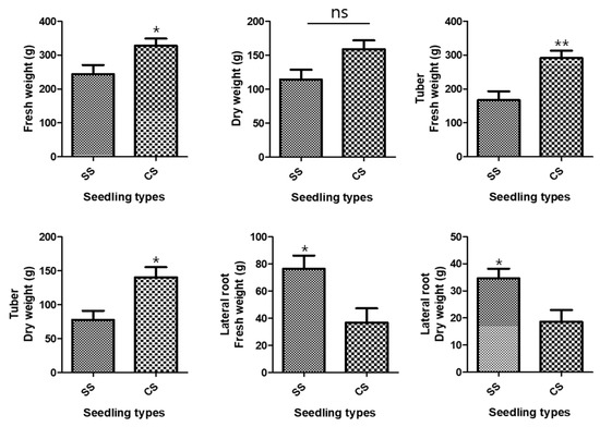 Development of the underground parts. Comparisons between the two types of Polygonum multiflorum seedlings [seed seedling (SS) and culture seedling (CS)]. n = 10 samples containing all the underground parts; bar graphs represent each treatment mean ± standard error of the mean (SEM). Unpaired t-test with Welch’s correction was used to determine significant differences between SS and CS (ns = not significant, * p < 0.05, ** p < 0.01).