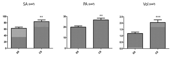 Size characteristic comparisons of the medicinal root tubers in the different seedling types. SA: Surface area; PA: Projected area; and Vol: Volume. n = 5 root tubers; bar graphs represent each treatment mean ± standard error of the mean (SEM). Unpaired t-test with Welch’s correction was used to determine significant differences between the seed seedling (SS) and culture seedling (CS) types (** p < 0.01, *** p < 0.001).