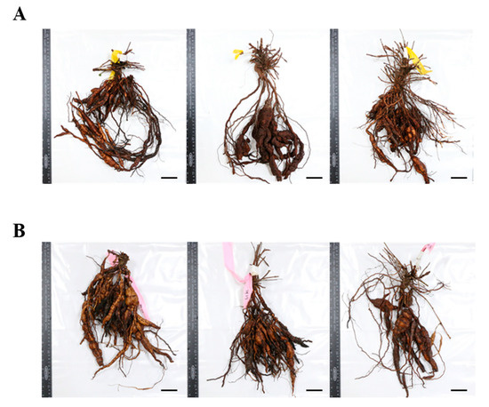 Comparison of the 1st year seedling underground root morphologies. (A) Seed seedling (SS) and (B) culture seedling (CS). Scale bar indicates 5.0 cm.