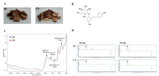 Liquid chromatography-mass spectrometry (LC-MS) analysis of the two types of Polygonum multiflorum: (A) seed seedling (SS) and culture seedling (CS). (B) Chemical structure of 2,3,5,4′-tetrahydroxystilbene-2-O-β-d-glucoside (TSG). (C) Fourier transform near-infrared spectrum (Blue peak SS; Red peak CS). (D) UV chromatogram of the LC-MS results for the CS- and SS-derived plant. The detection wavelengths were 254 and 315 nm, and the red arrow indicates the TSG peak.