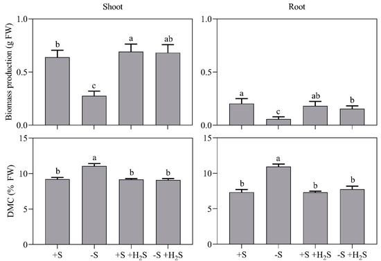 Biomass production and dry matter content (DMC) of barley shoots and roots in the presence and absence of a H2S and sulfate supply. Seven-day old seedlings were grown on a 50% Hoagland nutrient solution at 1 mM (+S) or 0 mM sulfate (−S) and exposed to 0 or 0.6 µL L−1 H2S for 7 days. The initial shoot and root weights were 0.16 ± 0.01 and 0.08 ± 0.01 g FW, respectively. Data on biomass production represent the average of 2 experiments with 12–13 measurements with 3-6 plants per measurement (±SD). Data on DMC represent the average of 3 measurements with 6 plants per measurement (±SD). Significant differences between treatments are indicated with different letters (P ≤ 0.05; two-way ANOVA; Tukey’s HSD test as a post-hoc test).