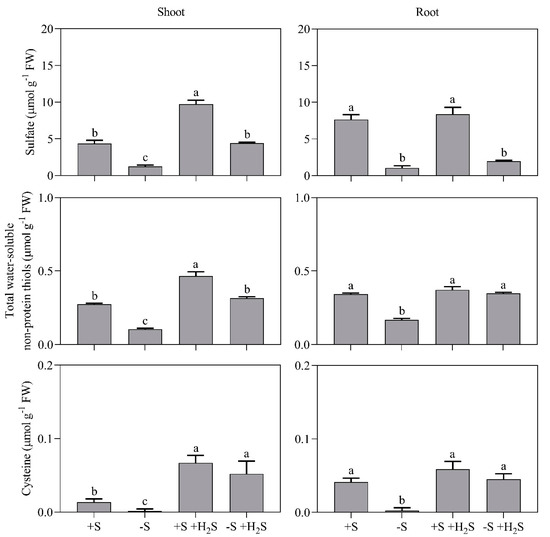 Sulfate, total water-soluble non-protein thiol and cysteine content of barley shoots and roots in the presence and absence of a H2S and sulfate supply. For experimental details, see the legend of Figure 1. Data represent the average of 3 measurements with 3 plants per measurement (±SD). Significant differences between treatments are indicated with different letters (P ≤ 0.05; two-way ANOVA; Tukey’s HSD test as a post-hoc test).