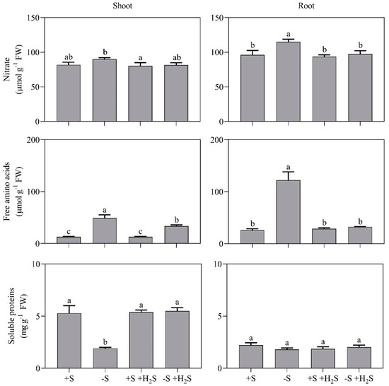 Nitrate, free amino acid and soluble protein content of barley shoots and roots in the presence and absence of a H2S and sulfate supply. For experimental details, see the legend of Figure 1. Data represent the average of 3 measurements with 3 plants per measurement (±SD). Significant differences between treatments are indicated with different letters (P ≤ 0.05; two-way ANOVA; Tukey’s HSD test as a post-hoc test).