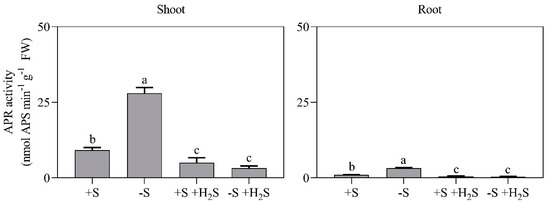 APR activity in barley shoots and roots in the presence and absence of a H2S and sulfate supply. For experimental details, see the legend of Figure 1. Data represent the average of 3 measurements with 3 plants per measurement (±SD). Significant differences between treatments are indicated with different letters (P ≤ 0.05; two-way ANOVA; Tukey’s HSD test as a post-hoc test).