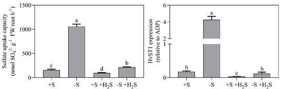 Thus, in the current research, the interaction between atmospheric H2S and rhizospheric sulfate nutrition was analyzed in barley. Plants were H2S fumigated in the presence and absence of a sulfate supply. The mineral nutrient composition, S and N metabolite content, APR activity, and the expression and activity of the root sulfate transporters were analyzed.
