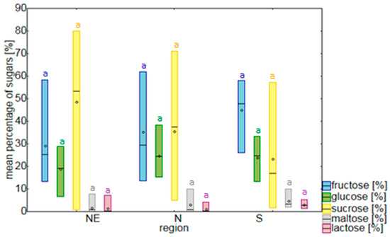 The mean nectar sugar concentration for the investigated populations of P. caeruleum was 409.9 ± 344.8 µg/µL (range was from 145.72 to 1102.7 µg/µL per population), with significant differences between the studied populations (Chi-square = 22.87, df = 13, p = 0.04) (Table 1). The main sugar components detected in all study samples were sucrose, fructose, and glucose (with mean proportions, respectively, of 42.1 ± 22.7%, 32.8 ± 14.4%, and 21.0 ± 7.1%). Maltose and lactose were also present in most of the analyzed samples (characterized by mean proportions, respectively, of 2.5 ± 3.2 and 1.6 ± 2.1%). The proportions of detected sugars were highly variable among the studied populations, with significant differences in sugar composition between populations for maltose (Chi-square = 24.71, df = 13, p = 0.03). Considering the geographical distribution of populations, sucrose predominated in northeastern Poland, whereas fructose predominated in the southern populations. However, these differences were not significant (Figure 1). There were also no differences in sugar concentration between the three designated geographical regions representing groups of studied populations (Chi-square = 10.75, df = 2, p > 0.05).