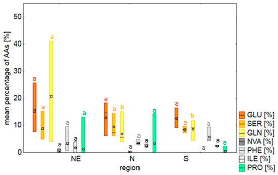 The mean percentage of AAs selected for the linear mixed models and proline (vital AA for pollinators) in populations of Polemonium caeruleum from three regions in Poland. GLN (glutamine), GLU (glutamic acid), SER (serine); ILE (isoleucine), PHE (phenylalanine), NVA (norvaline), and PRO (proline). The sample number for each region was n = 18 for northeastern (NE) populations, n = 7 for northern (n) populations, and n = 4 for southern (S) populations. The line in the middle of the box represents the median and the circle represents the mean. Boxes extend from the 5th to 95th percentiles. Means of AAs that varied significantly between regions are marked with different letters (p < 0.05).