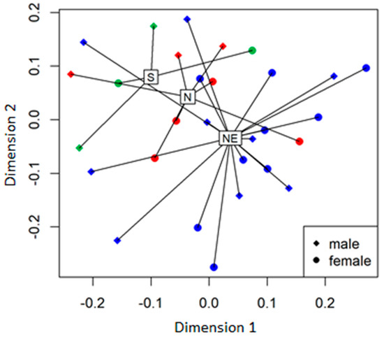Non-metric multidimensional scaling (NMDS) results based on Bray–Curtis distances of nectar component proportions (sugars and AAs) of Polemonium caeruleum during the male and female flowering phase from 14 populations. Colors indicate groupings by regions, which are significantly different: northern (N)—red, northeastern (NE)—blue, and southern (S)—green (F = 2.34, df = 2, p = 0.04). Each sample is displayed as a square (for the male flowering phase) and a circle (for the female flowering phase).