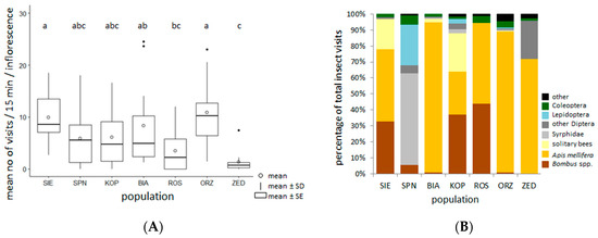 (A) Mean frequency of insect visits in seven selected populations of Polemonium caeruleum. Means with various letters are different at p < 0.05. (B) Taxonomic diversity of insects visiting flowers. Populations are arranged in ascending order according to their size.