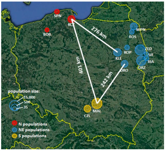 Distribution of Polemonium caeruleum study populations in Poland. The size of the circles corresponds to the log-transformed size of populations (number of flowering shoots), and the circle color corresponds to one of the three regions. The distances between the closest populations from each region are presented.