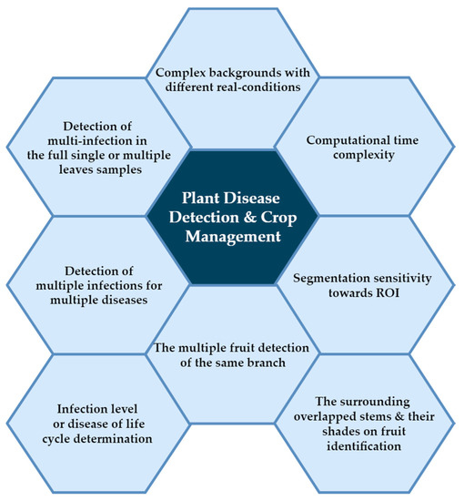 Using a plant village dataset exclusively [29], high accuracy can be obtained only by training models using real-condition samples. The detection of multiple infections in single or multiple leaves is another challenge in this field. One study [30] proposed two CNN models: one trained using full leaf sample images, and the second trained using segmented leaf samples containing different symptoms from the same training dataset of the first model. The findings indicate that the second model showed superior performance over the first model based on measurements of both final classification accuracy and the Quartile Coefficient of Dispersion (QCoD) of confidence difference between the models. However, it was unable to detect multiple infections for multiple diseases, and improvements are needed at the level of segmentation. Other issues include the detection of small objects for multi-label image datasets, pest detection [31,32], infection level determination, disease life cycle identification and mild symptoms [33]. Another challenge in this domain is fruit recognition for harvest purposes; the authors of [34] proposed an altered Yolo architecture, comprising 11 layers, that divides the input image into two grids of small blocks to improve detection performance. According to the researcher, the developed method could not detect more than one object in the same grid cell. The identification process in classifiers is based on how ROIs are localised. Many techniques have been discussed in relation to this issue, including segmentation, object detection and hybrid methods that supply classifiers with contextual information related to the ROI and thereby affect their performance [35].