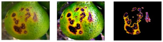 A detection method that achieved 96.90% accuracy was proposed in [25]. It combined several processes: first, the original image was enhanced using a hybrid Top Hat–Gaussian filter to illuminate the undesirable effects of brightness; second, the infected regions were highlighted (as in Figure 2) to differentiate them from the background by using a threshold skewness; and finally, a weighted High-Dimensional Colour Transform (HDCT)-based saliency segmentation was applied, proving its efficiency compared with Otsu, Expectation Maximisation (EM) and contour segmentation.