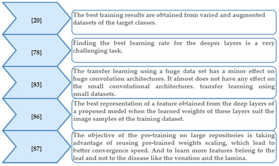 To train a DL classifier, large datasets are required, comprising a vast number of parameters to be tuned to control training convergence. All the parameters of the proposed model have to be managed (bias, weights, learning rate, mini-batch size, epochs) according to random Gaussian distributions, which is considered a very challenging task [78]. Learning or training from scratch consumes data and time. The availability of large, multi-labelled and well-annotated dataset repositories eliminates the need for researchers to collect massive datasets in different real conditions and environments that would need the oversight of agricultural specialists to be interpreted. Transfer learning allows a CNN model to acquire weights from another model that has already been pre-trained on a large labelled dataset [79,80,81]. The pre-trained model’s parameters must be fine-tuned, and the final layer is replaced with a new layer for convenient transfer of the weights to the proposed new model and the new classes in the target dataset. In [78], all the layers of a CNN model were fine-tuned using the ImageNet dataset at a specific learning rate that was lower than the default rate. The last fully connected layer was randomly initialised and trained to be adequate for the new classes; however, according to the researcher, finding the best learning rate for the other, deeper layers was a very challenging task. Another study about the pre-training effect on plant disease classifiers [82] compared the usage of nine different DL models by employing two approaches: first, transfer learning with the replacement of the last three layers with (fully connect, SoftMax, classifier) layers; and second, taking the result of the feature extraction at specific layers of these models and feeding them to different machine learning (ML) classifiers. The second approach was faster and achieved higher accuracy than the first. The highest accuracy levels achieved were 97.45%, resulting from the feature extraction of ResNet101 with an Extreme Learning Machine (ELM) classifier, and 97.86 from ResNet-50 with an SVM classifier. Meanwhile, transfer learning using small datasets with ResNet-50 achieved 94.60% accuracy [83]. In [20], the proposed transfer learning strategy was enriched by using three different datasets: first, the PlantVillage repository, which was further labelled with two bounding boxes to determine the leaf and infected areas; second, a collected dataset containing certain mandatory information (e.g., a certain disease’s life cycle for a specific plant for certain species); and third, an artificially generated dataset. The accuracy obtained by the trained model was 93.67%. In [84,85], the researchers suggested a first round of training using transfer learning from the original and augmented samples of a large-scale dataset which is in the same domain of the targeted dataset, followed by re-training the model using the original and augmented samples of the target dataset. The highest accuracy achieved was 97.40%. The basic findings of transfer learning are listed in Figure 5.