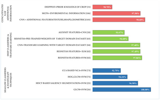 These methods has been compared in (Figure 6) with different types of technique that handle features in a way that makes classifiers able to diagnose the target object, Where in refrences [105,106], effective results were achieved in disease identification levels due to the ability of the model to categorise the factors of the symptoms. However the high accuracy achieved using shallow classifiers [25,26] with the handcrafted techniques, deep classifiers are still obtaining [82,84] better accuracy thant shallow ones.