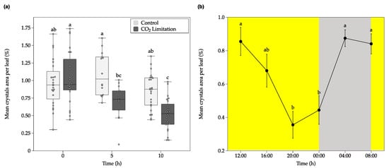 Figure 1. Fluctuations in total mean crystals area per leaf of C. quitensis plants under ambient or low CO2 concentration. (a), Boxplots representing the effect of the CO2 limitation treatment on leaf crystals area per leaf (%). The horizontal line indicates the mean and length of each whisker indicates the interquartile range (IQR); n = 14, different letters represent statistically significant differences (Two-way ANOVA; p < 0.05). In (a), plants were kept over time under constant light in airtight chambers injected either with ambient air (Control, 400 ppm CO2, white boxes) or filtered air with soda lime (CO2 limitation, 11.5 ppm CO2, gray boxes). (b), Diurnal fluctuations in CaOx crystal area in C. quitensis leaves. Plants were grown under optimal growth conditions. Yellow background denotes light hours, while gray background dark hours. Error bars denote SE of mean; n = 15. Different letters represent statistically significant differences between time of the day (one-way ANOVA; p < 0.05).